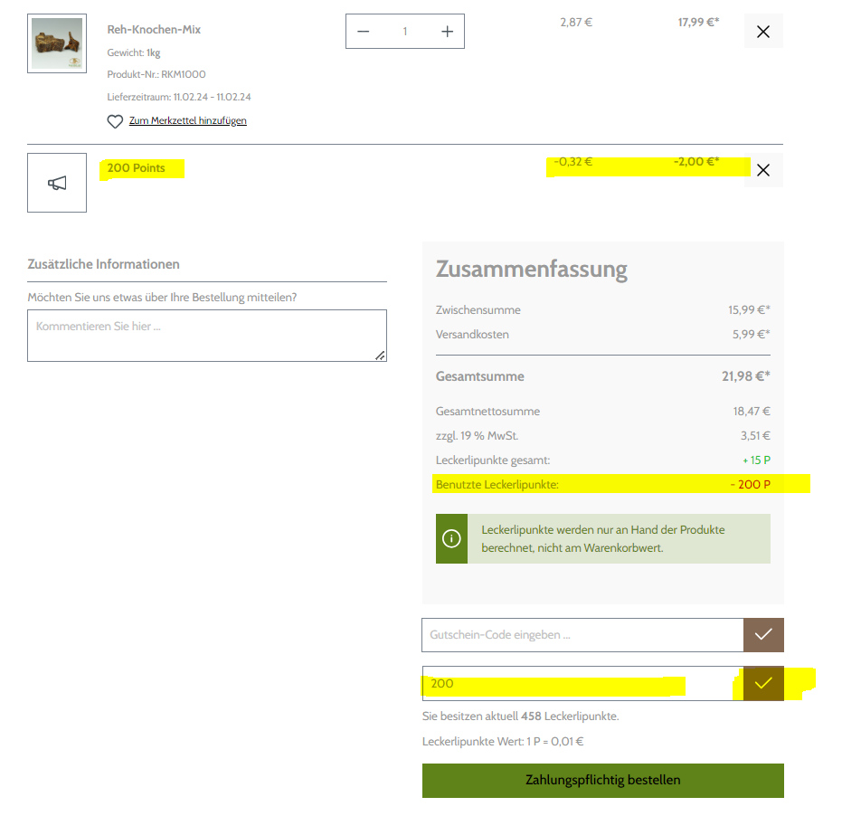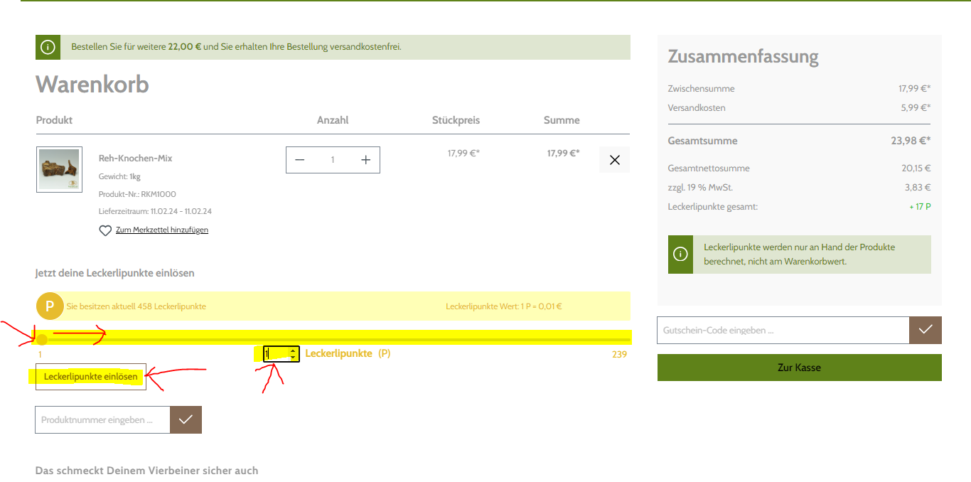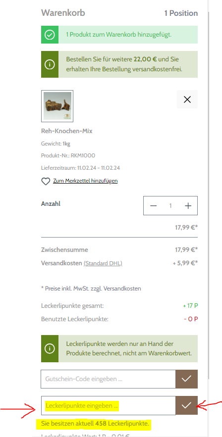 Einlösen kannst Du die Leckerli-Treue-Punkte im Warenkorb oder im Kassenbereich.